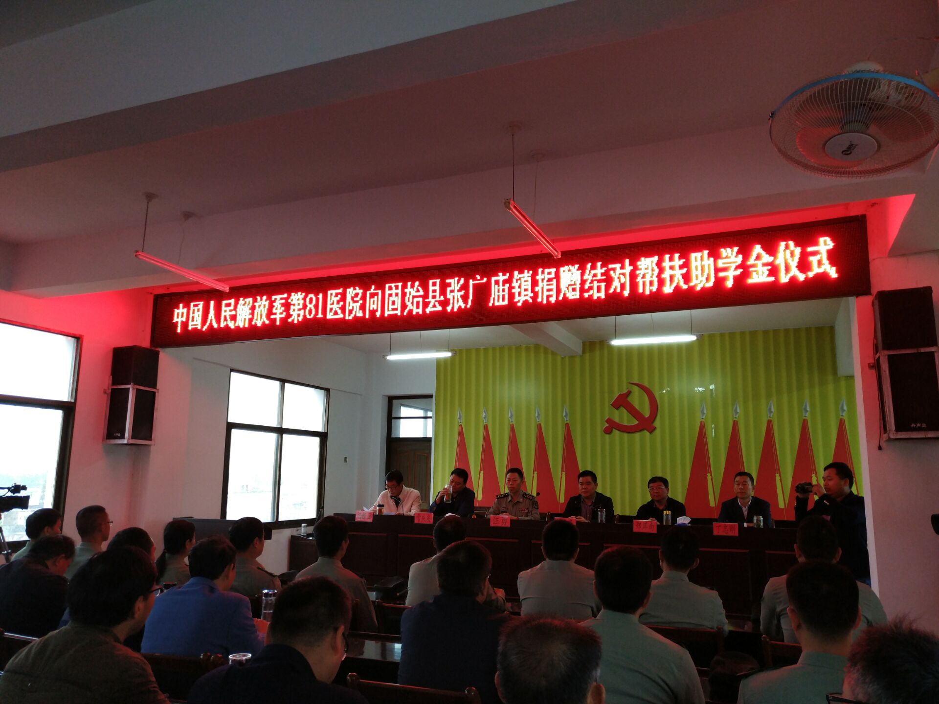 10月11日下午,中国人民解放军第81医院的院领导和医疗技术专家一行来到张广庙镇,开展捐赠结对帮扶助学活动,县委常委、副县长姚宏亮,县政府党组成员郑岸南以及县卫计委、张广庙镇等单位相关同志参加仪式。