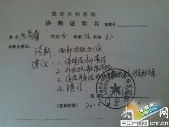 4月中旬,王先生带着欢欢来到了位于北京的中国医学科学院整形外科医院,这是一家具备三甲资质的整形医院。从该医院出具的诊断说明书来看,建议半年后视恢复情况决定修复手术方案。