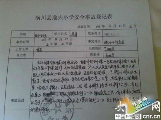 据王先生提供的《潢川县逸夫小学安全事故登记表》显示,2013年4月10号上午,幼儿园老师给孩子准备了很多水果。当时,欢欢的头发没有扎好,就让老师给她扎辫子。老师就把水果刀套上刀套,把刀放在了桌上的角落里,给她扎辫子。就在这个时间,3岁的男孩林林(化名)趁老师不注意,拿着水果刀就往欢欢脸上划了一刀,伤口从右脸额头往下一直到嘴角。