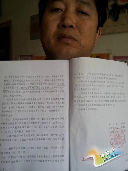 我是河南省信阳市潢川县人大代表李万均,为讨回一百余名农民工工资,2010年至今奔波两年多拿到河南省高院胜诉判决,却被商丘市房地产建筑商——河南省广宇建设集团有限公司和开发商河南应天工程管理有限公司勾结商丘警方对我个人栽赃陷害,阻碍生效法律判决执行。我作为一名为农民工维权的基层人大代表,泣血控诉商丘市公安局经侦支队部分办案人员违法插手经济纠纷,充当不良开发商和建筑商的保护伞。现将详细情况反映如下: