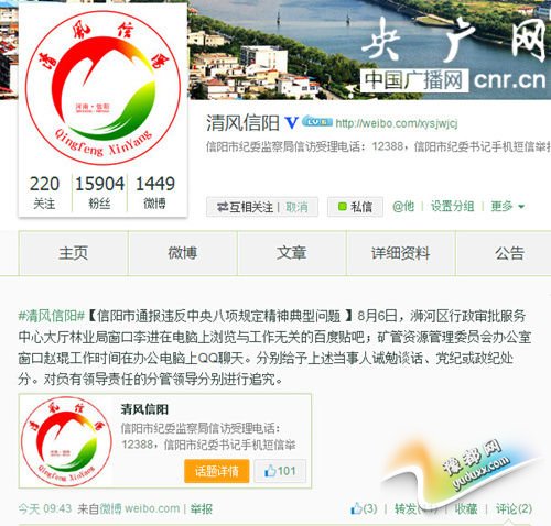 9月22日,信阳市纪委通过其官方微博“清风信阳”发布消息,8月6日,浉河区行政审批服务中心大厅林业局窗口李进在电脑上浏览与工作无关的百度贴吧;矿管资源管理委员会办公室窗口赵琨工作时间在办公电脑上QQ聊天。分别给予上述当事人诫勉谈话、党纪或政纪处分。对负有领导责任的分管领导分别进行追究。