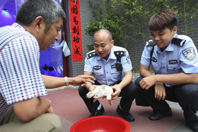 发现这只白甲鱼的村民及时向新县森林公安局报案,森林公安局第一时间赶赴周河乡毛铺村,进行全面了解,这只白甲鱼身长约20厘米,宽约16厘米,重约1500克,四肢、头和壳都是白色,壳和颈上有少许暗斑。